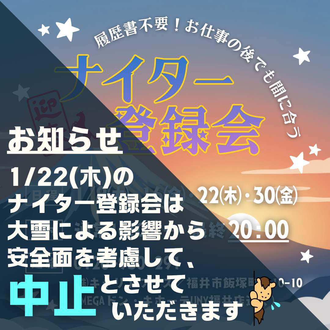 お仕事帰りにも立ち寄れる『ナイター登録会』、1月も開催します!